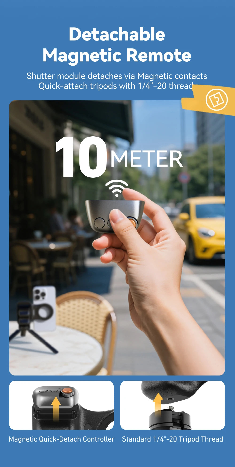 Convierte tu smartphone en una cámara profesional con la empuñadura magnética TELESIN Fun Shot. Diseñada para brindar mayor estabilidad y control al grabar o tomar fotos, esta empuñadura incluye un potente imán, soporte ajustable y control remoto por Bluetooth compatible con Android e iOS. Ideal para vlogs, selfies, viajes y grabaciones creativas.